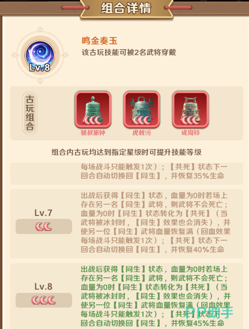 第二套高优先级组合由【虢叔旅钟】【虎戟镈】【成周铃】构成。激活后,佩戴武将入场即获得“同生”状态。其核心规则为:当该武将生命值归零时,若场上存在另一名处于“同生”状态的友方单位,则当前角色不会阵亡,转而触发“共死”状态;同时,另一名“同生”武将立即恢复全部生命值(单场限1次)。进入下一回合后,“共死”自动转化为“同生·45%”状态,并额外恢复45%最大生命值。该机制本质是构建双核生存链,显著延长核心单位持续作战时间。建议将此套分别装配于队伍中战力权重最高的两名角色——通常为主力输出与核心辅助,形成攻守联动的韧性体系。