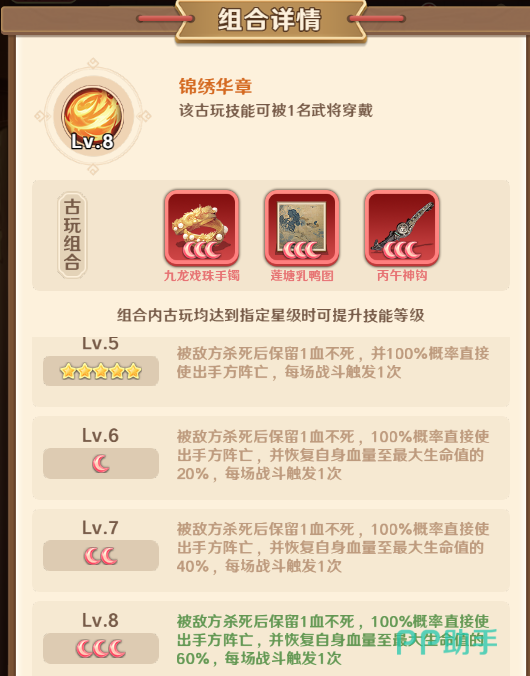 第三套强力保命组合包含【九龙戏珠手镯】【莲塘乳鸭图】【丙午神钩】。激活后,佩戴者在被敌方单次攻击直接击杀时(即一击致死),将强制保留1点生命值,并立即对造成该次击杀的敌方武将发动反杀,对其造成等量伤害;同时自身恢复60%最大生命值(单场限触发1次)。该效果兼具生存延续与战术逆转双重价值,尤其适配高爆发但生存能力偏弱的副输出位。主力输出通常享有团队保护资源,而二号、三号输出更易成为集火目标,装配此套可大幅提升其战场存活率与反制能力,改变敌方集火策略预期。