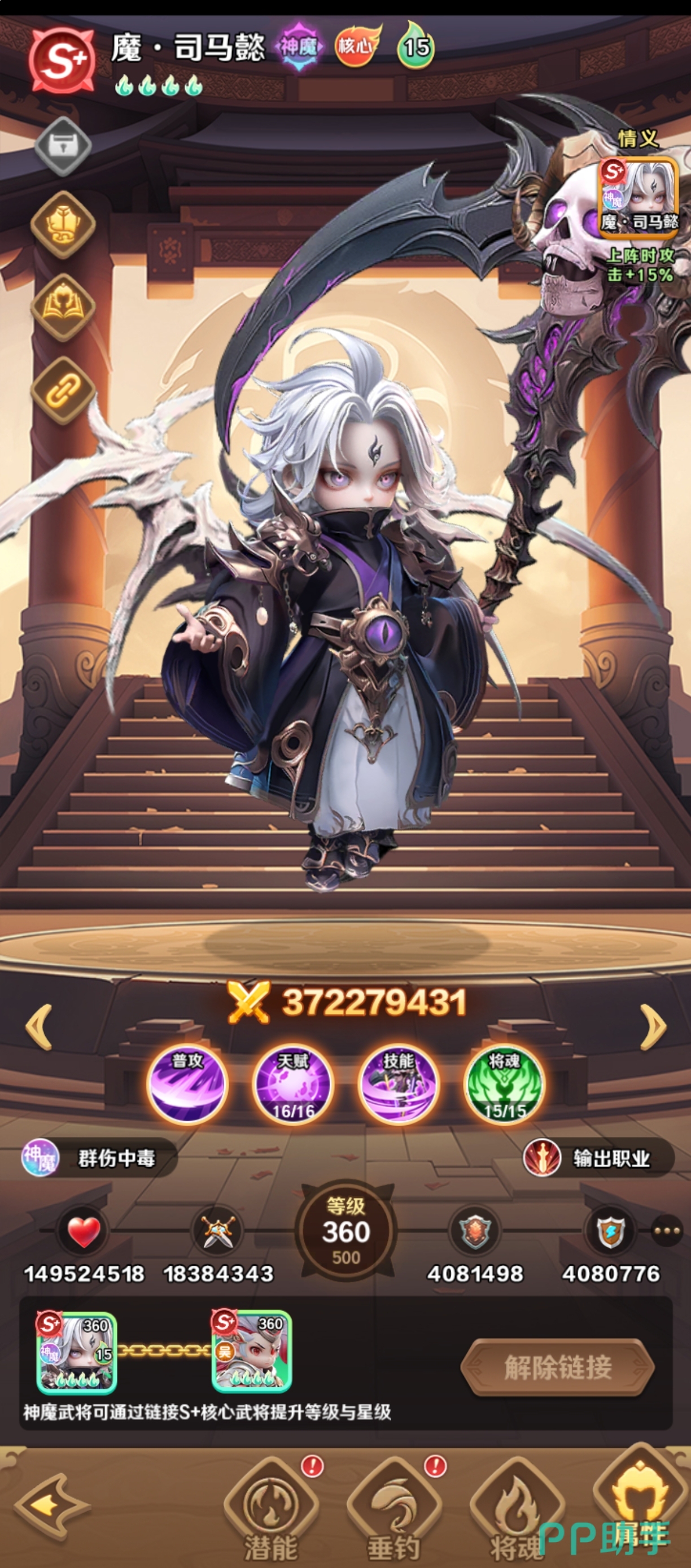 面对高防御敌方阵容或需持续压低血线的PVE环境,魔司马懿是首选对策型武将。其核心机制为群体中毒效果:主动技能可对全体敌人造成650%法术伤害,并有概率附加持续两回合的中毒状态。该效果无视部分减伤机制,能稳定削弱敌方前排生存能力,在攻坚高护甲BOSS或持久战中具备显著战略价值。