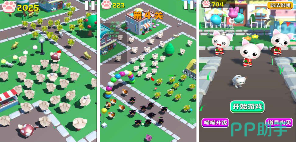 这是一款基于开放城市地图的群体控制类策略游戏。开局玩家选定初始猫群单位,通过移动路径引导其接触并同化散落于街道、广场、天桥等区域的中立猫咪,实现数量扩张与形态进化。随着规模增长,可解锁队列编组、行进速度加成及外观定制功能,例如更换领结、帽子或配饰。地图采用俯视角沙盒设计,支持昼夜循环与随机事件触发,增强探索多样性与重玩价值。