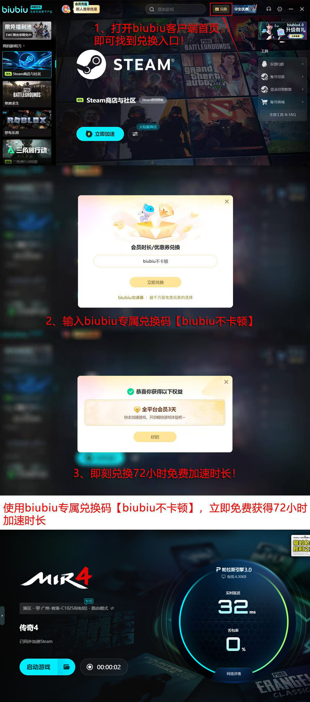 启用biubiu加速后,游戏网络吞吐能力明显增强:副本群怪拉取更顺滑、百人团本同步无延迟、沙巴克攻城期间同屏人数突破上限时仍保持帧率稳定。目前平台开放限时体验权益:新用户完成账号注册即可获赠24小时免费加速时长;参与【biubiu不卡顿】口令活动,输入指定口令还可额外领取72小时加速权限,累计可达96小时(即整整4天),足以覆盖各类高强度玩法周期。