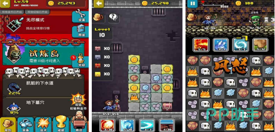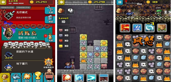 本作采用竖屏操作设计,以复古像素美术呈现地下城探索体验。玩家将深入未知黑暗领域,应对随机生成的陷阱、机关与怪物群落。核心战斗依托三消机制——连接三个及以上同色元素即可发动对应属性攻击,配合职业成长、装备熔炼、技能树升级等传统RPG模块。游戏内含试炼岛副本、百种以上法术配方组合及非线性地图结构,强化重复可玩性与策略延展空间。