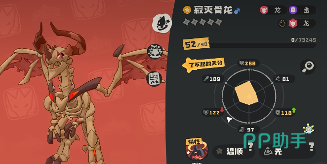 接下来要看的是特性和技能,首先是特性它拥有一个不朽特性,这是全游戏唯一的复活特性不过有复活时间,这个时间为六回合就是说只能在多精灵对战中才能发挥出效果,之后是技能只看它需要携带的核心技能。