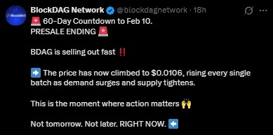 当一个热销的预售项目进入最后60天倒计时时会发生什么?对于BlockDAG来说,答案很简单——紧迫感、强劲势头以及全球投资者的涌入。BlockDAG预售的结束日期现已正式定于2月10日,这标志着其破纪录的上涨行情进入最后阶段,目前BDAG的股价已跌至0.0106美元。