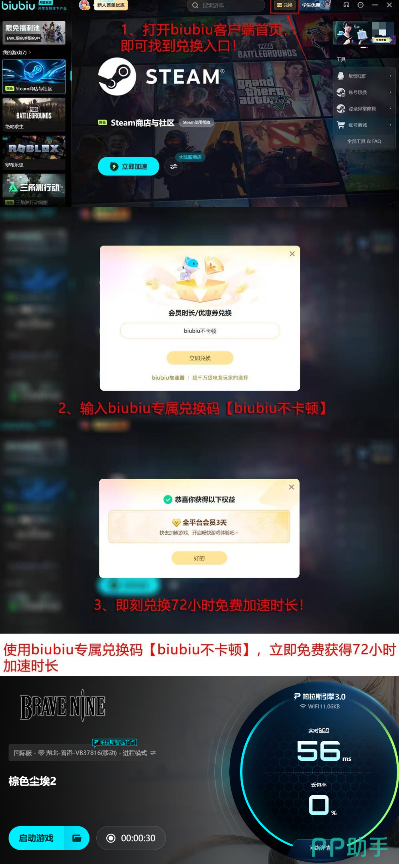 平台注重用户体验的渐进式引导,所有新注册用户均可即时领取24小时全功能加速体验权限;同时面向全体用户开放3天通用加速时长,无需付费订阅。只需在指定入口输入口令码【biubiu不卡顿】,即可完成兑换并立即启用,零门槛验证加速效果。