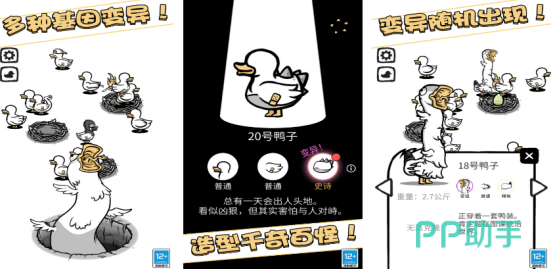 以模拟孵化为核心机制,玩家从一枚基础鸭蛋开始培育种群。随着孵化节奏加快,鸭子基因出现随机变异——体型异常膨胀、四肢比例失调、羽毛呈现荧光色、长出机械关节等离谱特征陆续登场。每只变异鸭拥有独立数值标签(如耐力值、突变等级、稀有度星级),收集与对比成为核心乐趣。游戏采用低多边形美术风格,配合魔性音效,强化“怪诞但上头”的体验。