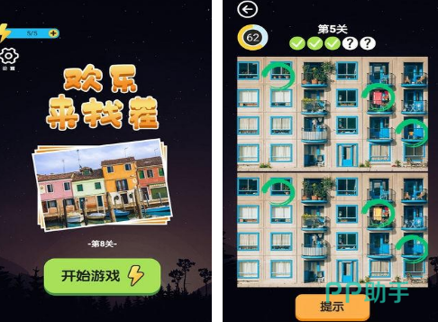 经典找不同玩法的移动端升级版本。每关提供两张高度相似的场景图,隐藏5处细节差异——可能涉及物品位置、颜色变化、元素增减或镜像反转等类型。关卡设计循序渐进,图像内容涵盖自然景观、城市街景、节日主题等多元题材,持续强化玩家的视觉分辨力与专注力训练。