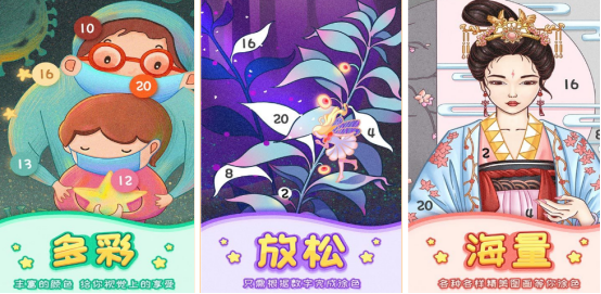 以二次元视觉语言为基调的数字填色应用,采用“数字暗号”上色机制——即通过图中数字对应色卡完成精准着色。收录百余款原创手绘线稿,人物立绘细腻,萌系元素丰富。新增画笔精灵引导系统,辅助用户理解配色逻辑,降低学习成本,强化正向反馈体验。