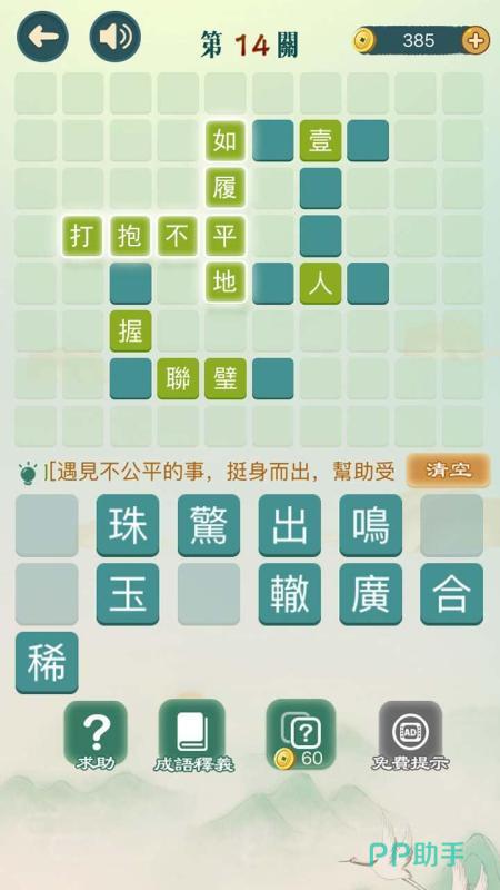 本作以典雅国风为视觉基调,辅以舒缓悠扬的背景音效,营造出浓厚的传统文化氛围。关卡设计逻辑严密,场景丰富多变,每关均嵌入一则经典成语典故,玩家通关后可即时阅读原文释义、出处及现代用法,实现“玩中学、学中悟”的双重目标。