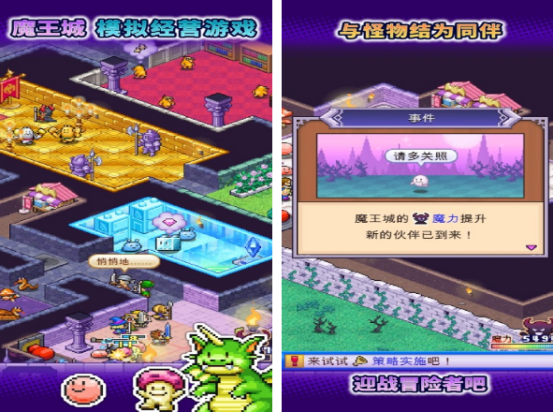 以复古像素风呈现的迷宫模拟经营游戏。玩家从废墟起步,逐步扩建魔王城堡,招募并培养各类怪物员工,打造专属地下城生态。通过合理规划房间功能、调整怪物配置,有效抵御闯入的勇者队伍。所有建筑升级、怪物图鉴与剧情章节均无需付费解锁。