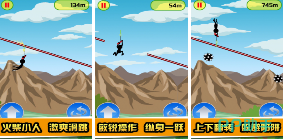 本作聚焦纯粹操作反应,采用单轴线性闯关结构。初始阶段即架设一条自上而下延伸的金属绳索,角色默认沿绳滑行。途中设置断口、旋转横杆、移动踏板等障碍,需通过短按跳跃、长按悬停、双击翻转等精确指令完成规避。界面实时显示当前滑行距离(米数),并记录最高成就值。关卡节奏紧凑,失败后即时重试,适合碎片时间挑战手眼协调极限。