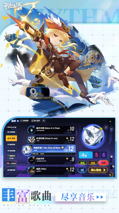 专业级下落式音游,采用四键、五键、六键三种输入模式,适配不同设备与操作习惯。曲库覆盖华语、日语、韩语、英语及电子、摇滚、古风、动漫等十余种流派,保持每周更新曲包机制。难度分级明确:入门级(1–3星)侧重单点识别,进阶级(4–6星)增加滑键、长按、双押复合操作,高阶谱面(7–10星)考验手速稳定性与节奏预判能力。全球排行榜实时同步,支持自定义皮肤与段位晋升系统。