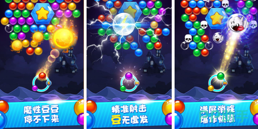 本作回归垂直下落式弹射消除框架:玩家从底部向上发射豆豆,使其与悬挂于上方同色豆豆组合达三颗及以上即可消除。基础规则易懂,但中后期关卡显著提升策略权重——冻结豆限制移动、障碍豆阻断路径、变色豆改变匹配逻辑,均迫使玩家提前规划弹道路径与连锁反应链。辅助技能与道具系统支持战前配置,允许根据关卡结构定制解法,实现“操作+思考”的双层满足。