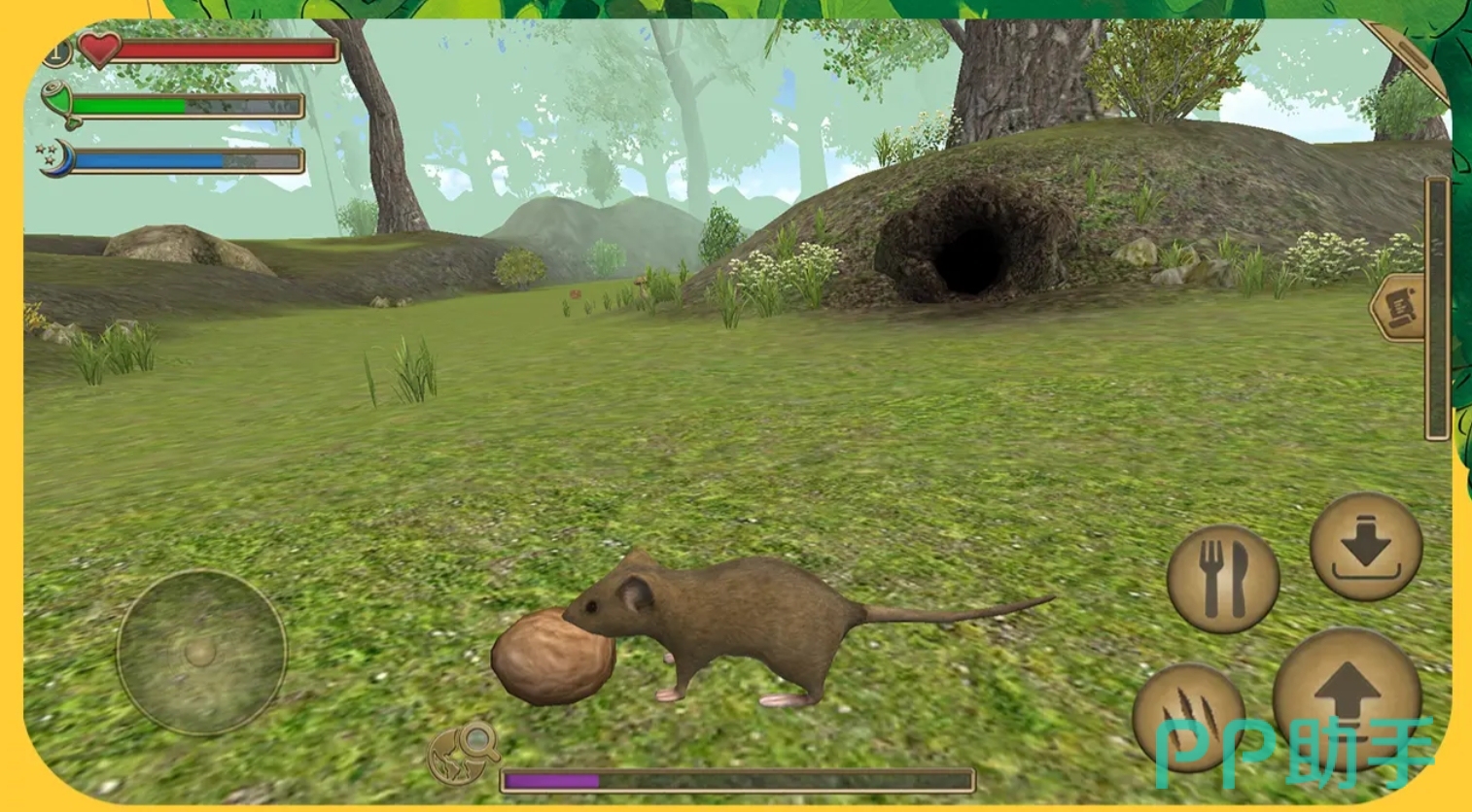 这是一款写实风格的老鼠生存模拟器。玩家操控一只野生老鼠,在开放森林环境中完成筑巢、觅食、避险三大核心循环。可通过挖掘地道构建多层地下巢穴,提升隐蔽性与安全性;食物来源涵盖浆果、昆虫、腐肉等多种类型,但部分资源需经辨识后方可食用,误食有毒植物将导致生命值持续下降。天敌包括猫头鹰、蛇、野猫等,同时老鼠亦可捕食小型节肢动物补充能量,形成动态生态链。