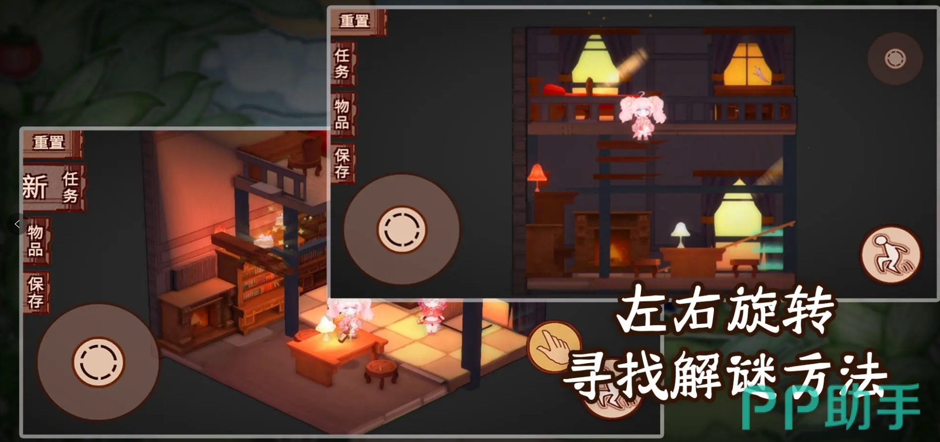 这是一款以视错位为底层机制的叙事向解谜游戏。玩家置身于一个色彩柔和、线条圆润的童话异境,所有场景均支持水平方向的平移操作。随着视角左右移动,建筑、道具与角色会因透视关系发生结构性重组——原本分离的平台可能拼合成完整通路,错开的门框会在特定角度严丝合缝地对齐,而储物箱、衣橱等物件的开启方式也依赖这种动态构图变化。角色造型延续手绘绘本风格,强化沉浸式幻想氛围。