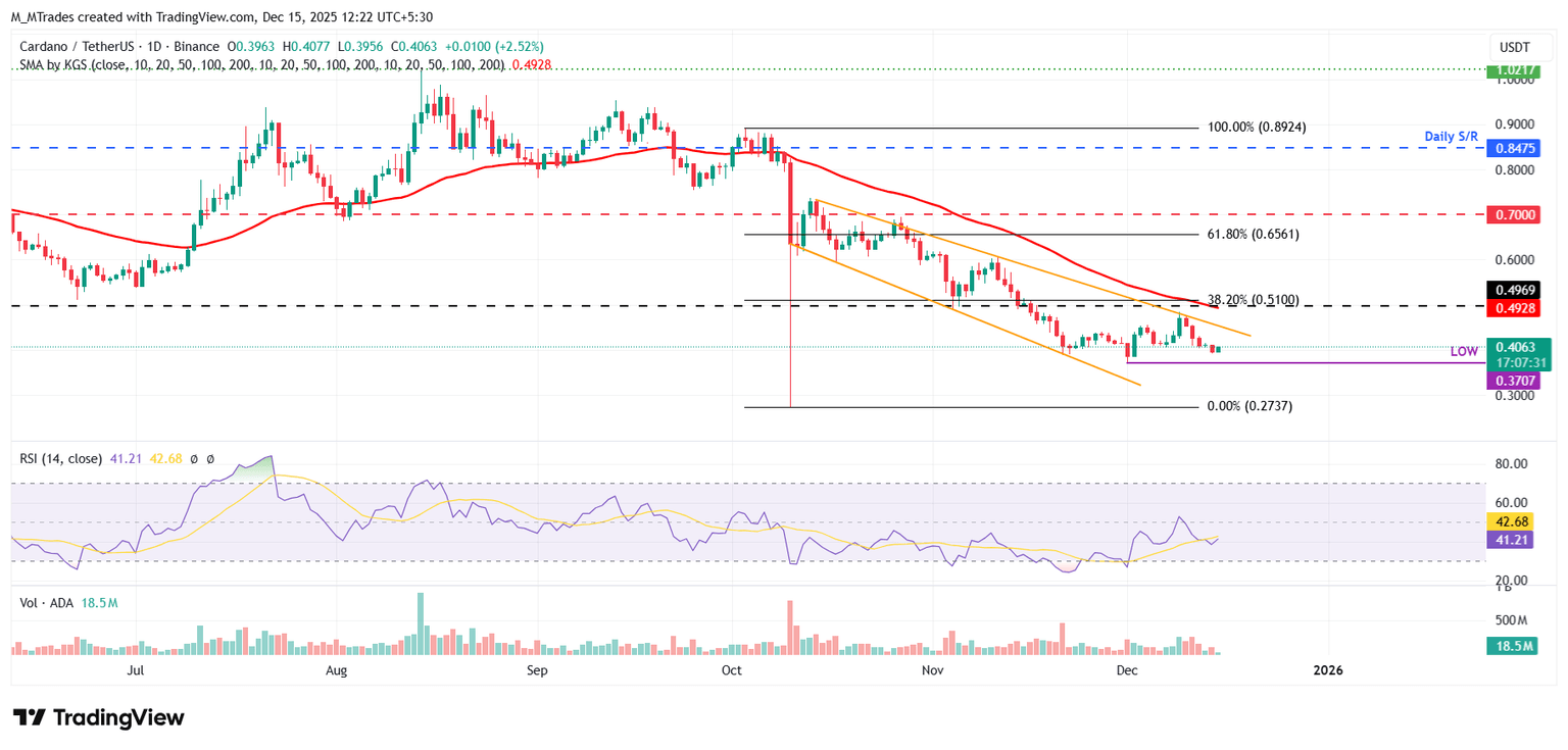 周三,Cardano 的价格在下跌楔形形态(由两条趋势线连接自 10 月中旬以来的多个高点和低点形成)的上轨附近受阻,截至周日下跌了 16%。截至周一,ADA 的价格在 0.40 美元左右徘徊。