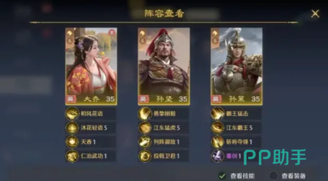正式作战可以让大乔作为主将,主修吴女柔情,来转移普攻保护队伍的核心输出孙策,副修乐善和奋鼓,让自己的治疗效果加20%,全队属性加8%,孙坚作为坦克主修刚毅系“以乱取胜”,这能在受到攻击时有40%概率震慑敌方,带来更好的保护效果。