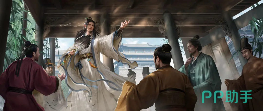 他“妙算”这个招式攻击敌方,如果对手处于无策状态,则本次伤害提升50%,若不在该状态中,攻击后有50%几率对该单位附加3秒无策;技能2“言谋”,在攻击敌人同时对他们添加“舌战群儒”,对手如果发动主动技,就会收到谋略伤。
