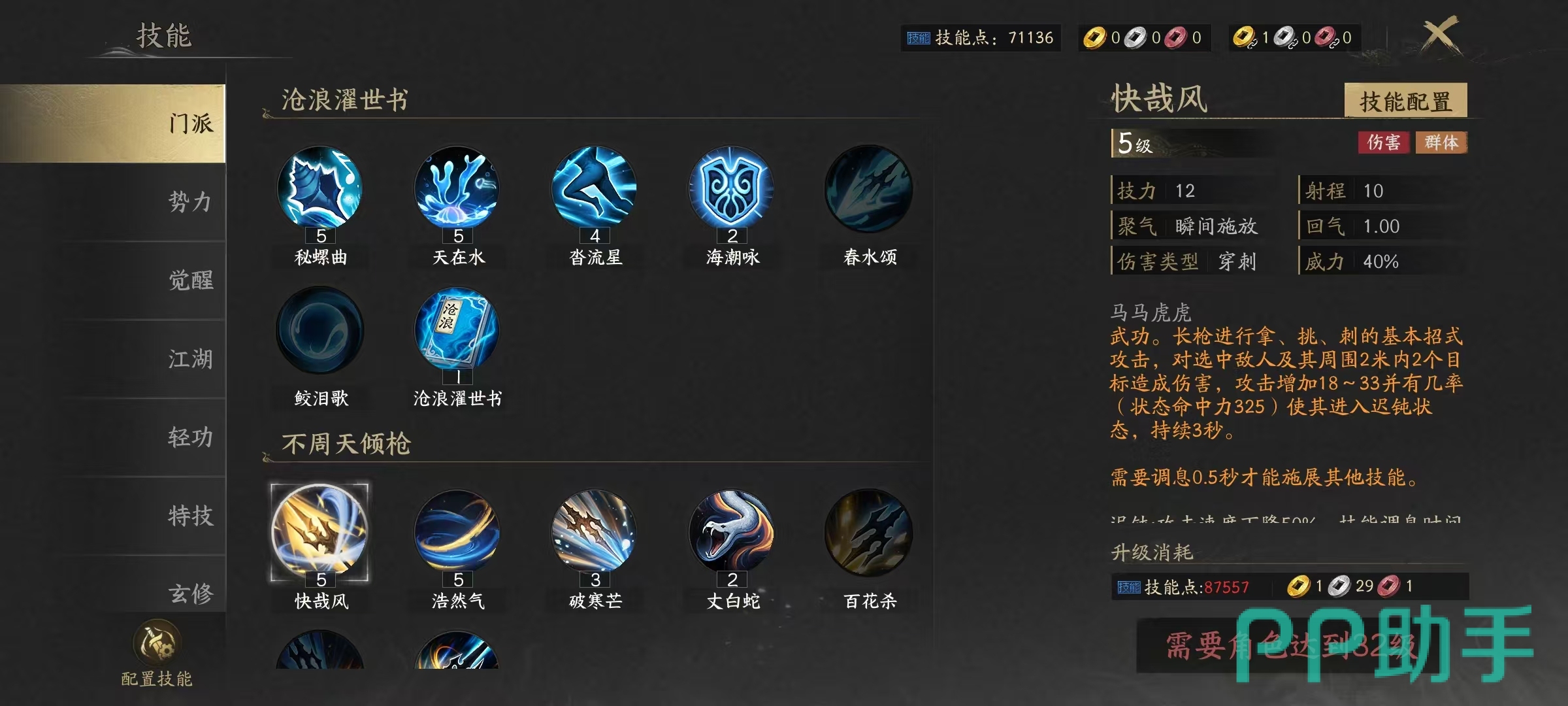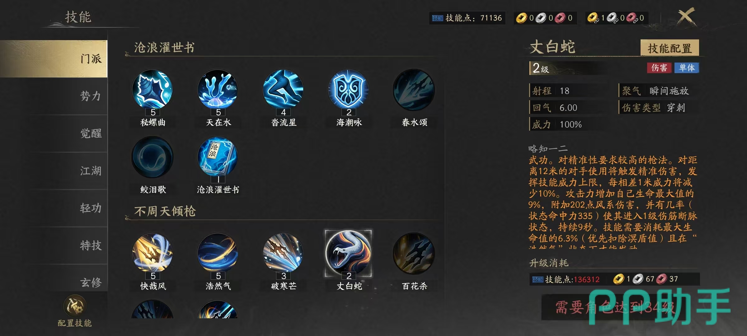 接下来是丈白蛇,这是核心输出技能,它的威力受到敌我双方距离的影响,除了伤害之外还带有破甲和生命加攻效果,输出很可观,但是要想发挥最大威力,必须要对距离有着精确的把控。第三个是浩然气,物理类心法,可根据力属性来增加物理攻击。第四个百花杀,近身输出技能加控制技能,自带效果能够限制对方。第5个快哉风,基础物理伤害技能可附带迟钝,也是常用的限制类型核心技能之一。