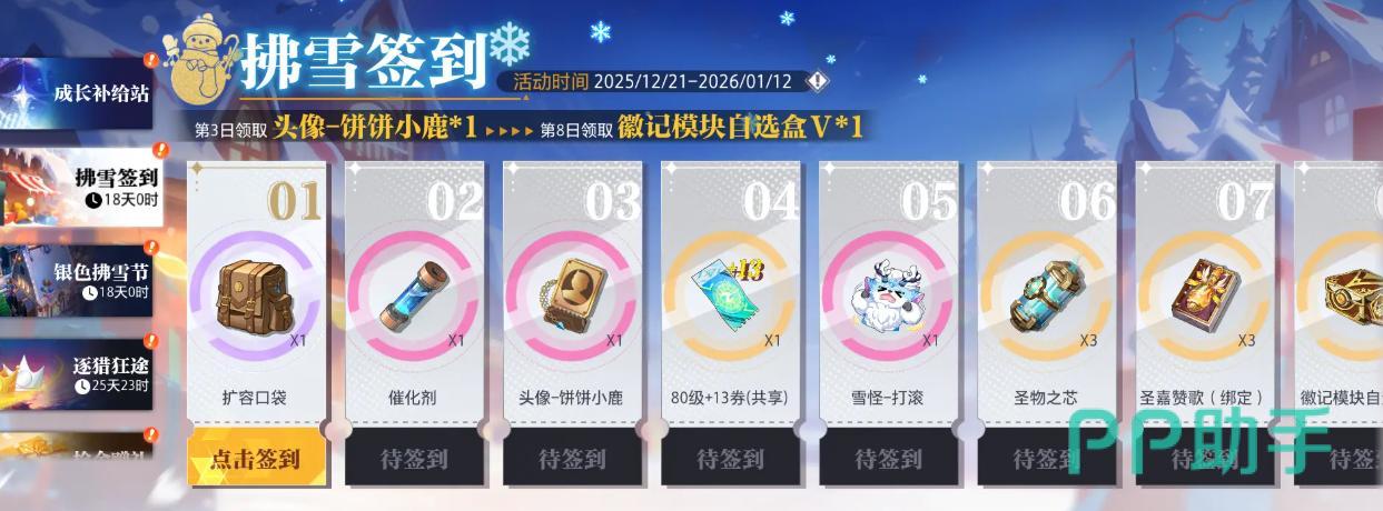 活动期间会开放拂雪签到活动,每天登录就能领到很多奖励,包括节日头像“饼饼小鹿”,80级的加13强化券,还有圣物之芯和徽记模块自选盒等超实用资源,这对角色养成和装备提升都是不小的帮助。