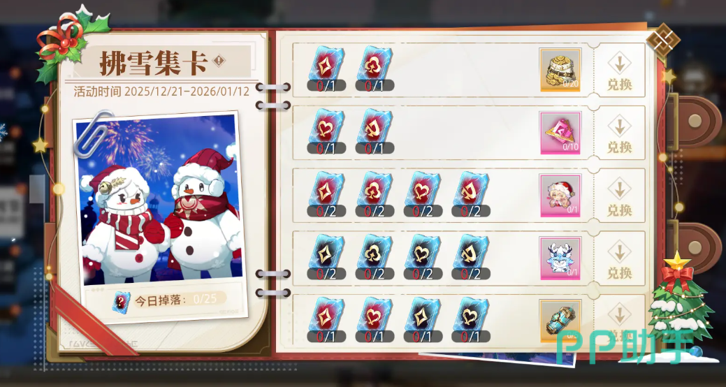 除了上面这些内容外,全新的拂雪集卡玩法和新的圣诞主题家园装饰也上线了。只要通关副本收集并交换凝冰扑克,就可以得到限定表情包和往期橙卡奖励。家园系统也新增节日装饰,大家可以自由布置。