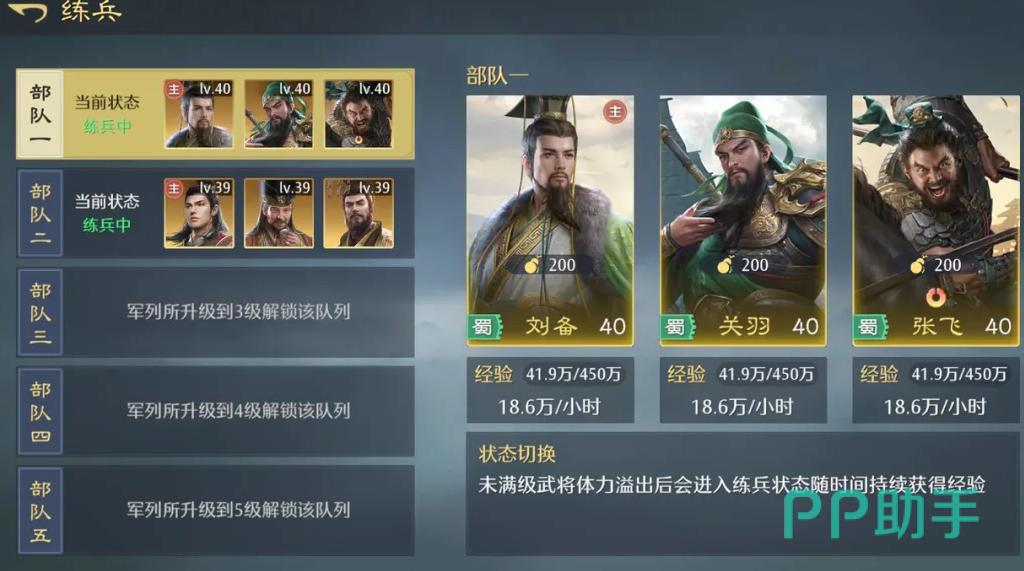 经验获取这一块,每场战斗同一支部队内的武将获得的经验是完全一致的,不同部队之间则是按照各自参参战情况分配。如果体力充裕,与其多分散队伍去打,还不如集中资源单队刷流寇,经验转化效率反而更高。对于时间不固定,有时候容易忘记上线的玩家来说,它还有一个练兵系统,这个也很友好。溢出的体力会自动转化为练兵经验,这样哪怕是长时间离线,也能保证等级上不被大部队甩开。
