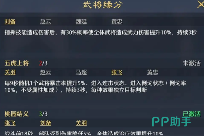 缘分关系,也是很多slg游戏里的羁绊,一些武将之间存在着缘分,只要满足条件就能自动激活,提升属性或是激活技能效果带来额外加成。缘分可以在每个武将的缘分界面单独查看,也可以在阵容界面下方的“加成”那里点开查看那,缘分也是阵容搭配会考虑到的一环,有缘分是再好不过了,但不强求。