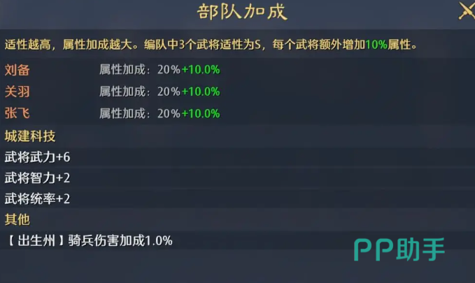 兵种搭配,这也是基础养成中不可忽视的部分,3个武将如果能凑齐同兵种,并且该兵种属性加成都是S,那么就可以凑出3S阵容,额外获得10%的属性加成,这个增益在前期尤为强势,也是早期阵容搭配时候会特别关注的,不仅看单个武将的强度,还兼顾兵种适配,尽量围绕着兵种来构筑,最大化收益。