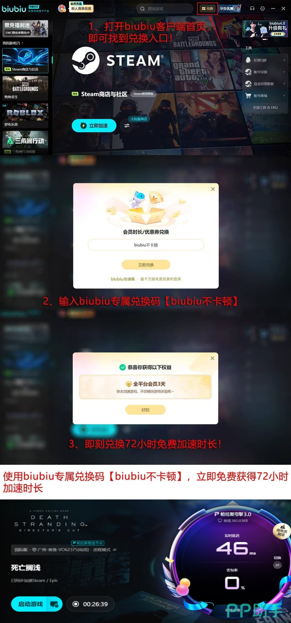 为便于用户验证效果,平台面向新注册用户开放24小时全功能免费试用权限。完成首次登录后,输入专属兑换码【biubiu不卡顿】即可额外获得72小时加速时长,累计达96小时。该福利同样适用于老用户,无需绑定设备或限制平台,覆盖PC端全场景使用需求。对于常遇卡关、加载失败或同步中断的玩家,启用加速服务后有望显著改善运行稳定性。