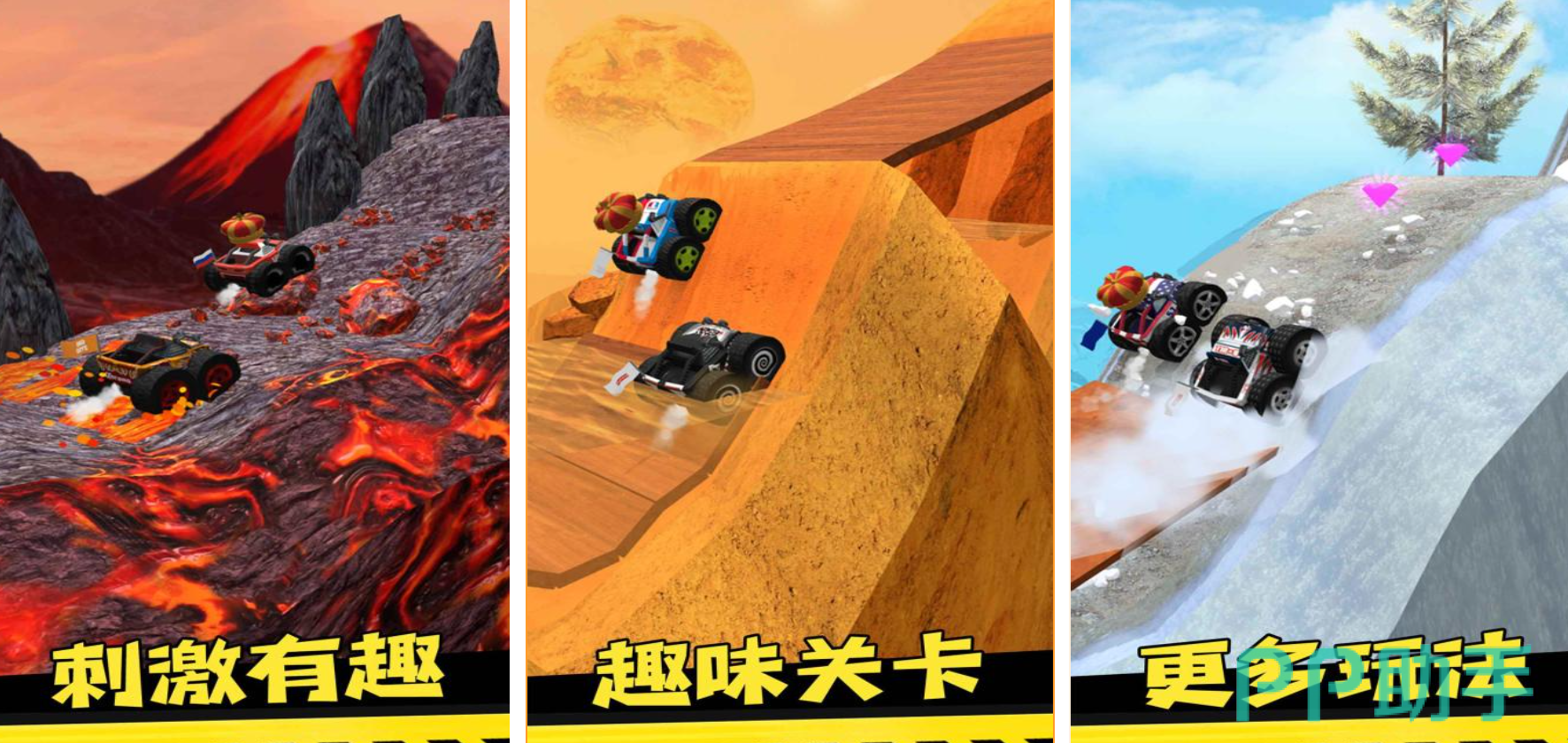 本作融合高速对抗与多变地貌,强调车辆在复杂坡道、连续发卡弯及起伏山脊上的动态平衡控制。玩家可切换山地、城市等主题赛道,不同地面材质(如碎石、泥沼、沥青)触发差异化的抓地力与悬挂反馈。油门精度成为通关关键,尤其在陡坡急刹与沙地漂移场景中,需实时预判重心偏移趋势。