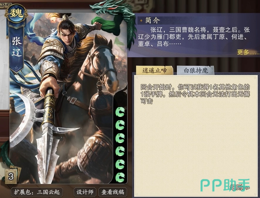 张辽的“突袭”技能可在其出牌阶段主动对一名其他角色发动一次拆牌,不依赖花色、不消耗额外条件,属于完全可控的刚性输出。与甘宁形成互补:张辽确保每回合至少1次稳定拆解,甘宁则在获取黑桃花色后提供额外拆牌机会,二者叠加可覆盖手牌区与装备区双重目标。即使甘宁连续未摸黑桃,张辽仍能维持基础压制强度;一旦甘宁触发黑桃条件,整套组合即刻升级为高威胁拆解单元,对敌方关键装备(如+1马、八卦阵、白银狮子)亦具备强针对性。