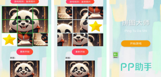 采用经典九宫格拼图结构,界面清晰分为上下两区:上方为打乱的9枚图块,下方为完整原图参考。题材涵盖国宝熊猫、自然风光等高清插画,考验玩家的空间感知力与逻辑还原能力。操作直观,节奏舒缓,适合作为日常脑力训练工具。