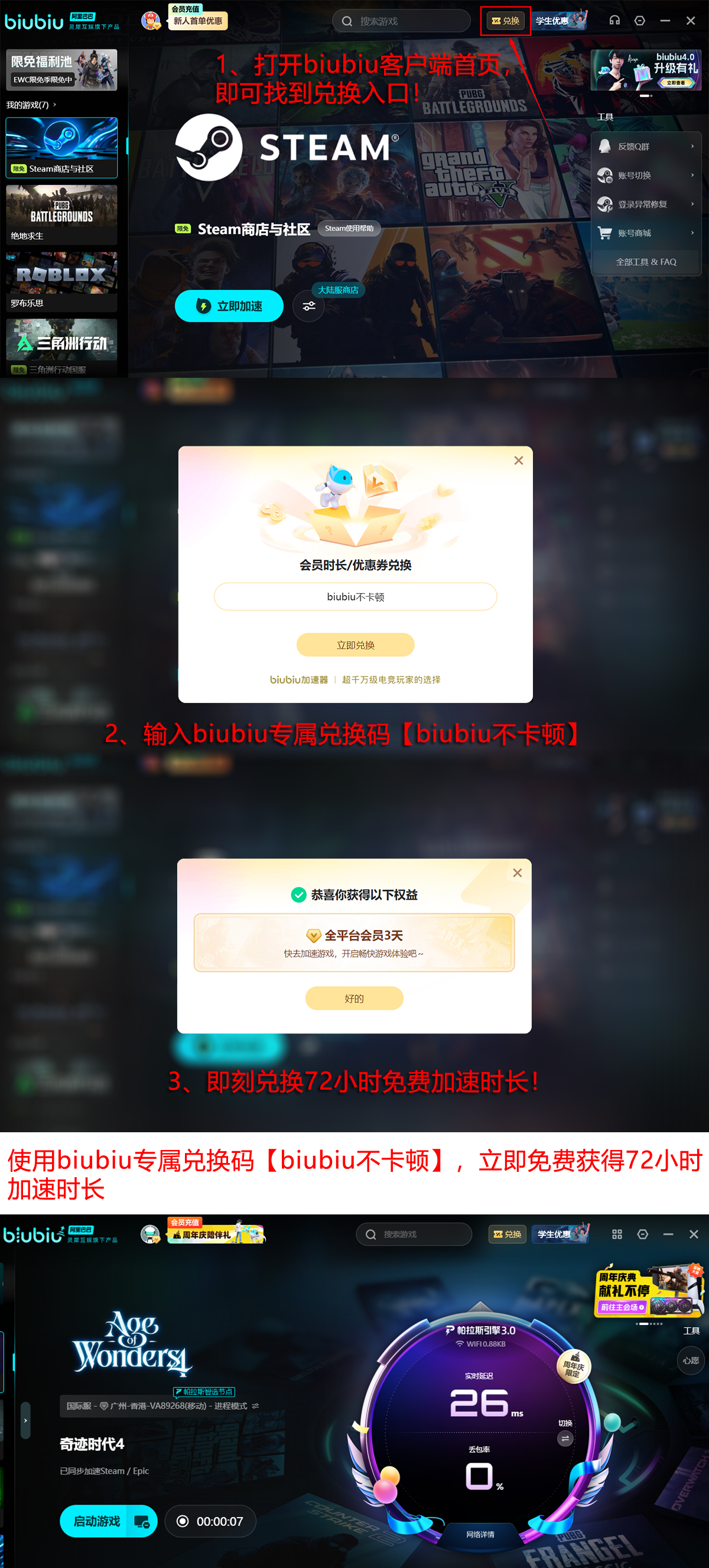 新用户完成注册即可领取24小时全游戏免费加速权益,实测可保障长时作战不中断、高负载场景不崩溃。如需延长使用周期,输入兑换码【biubiu不卡顿】,可额外获得72小时加速服务,该福利面向所有用户开放,限用一次。