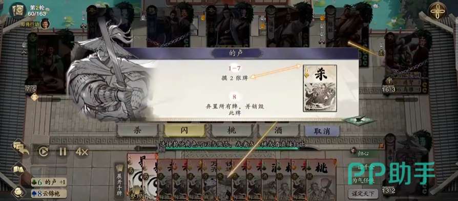 还有个坐骑是的卢,详细说下它的技能效果,手上卜卦,摸2张牌,可将8张专属坐骑放在牌堆中,集齐这8个,弃置所有手牌和装备,并销毁这张牌,战略价值很高。白蹄乌也非常不错,在造成击杀时可以摸三张牌;以及“乌雅”这个坐骑,在打出杀的时候,可以摸到一张牌;它们大多数技能都是围绕摸手牌展开。