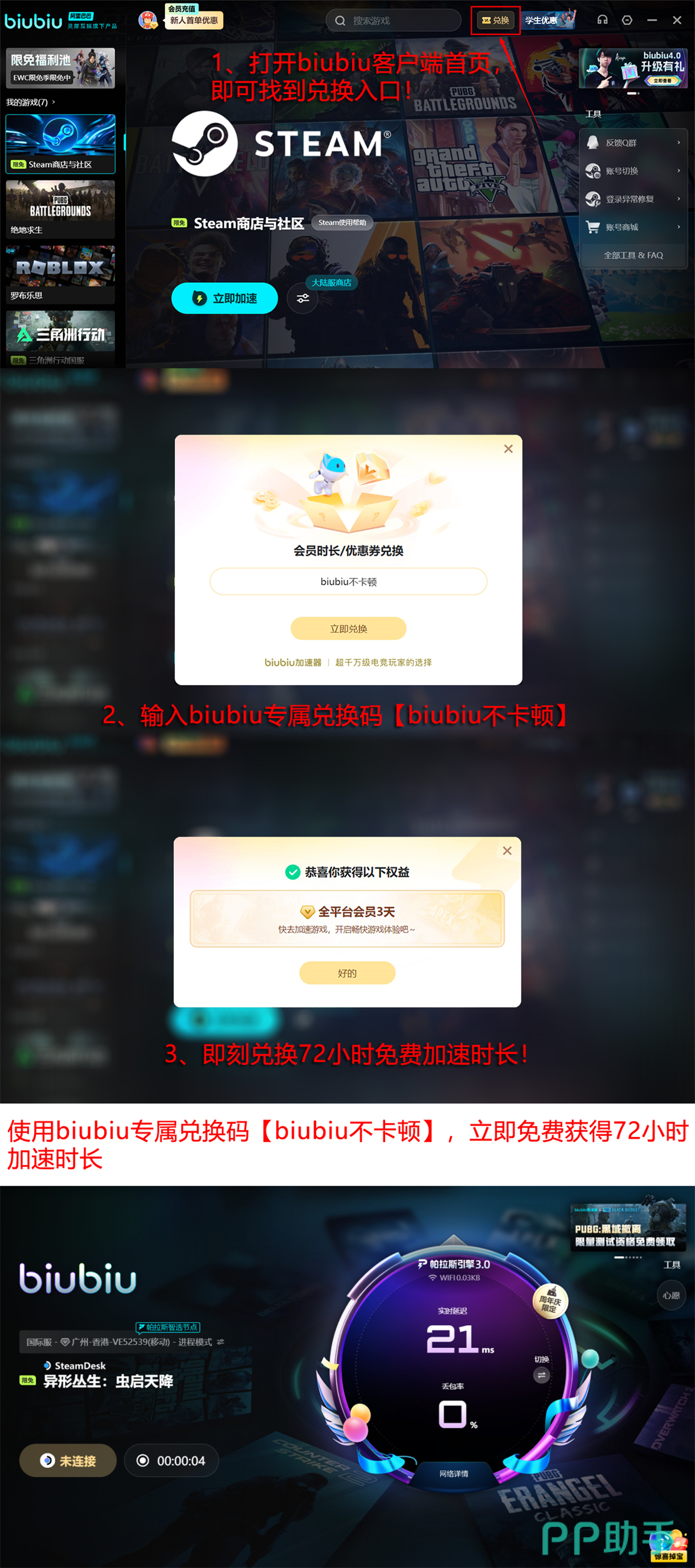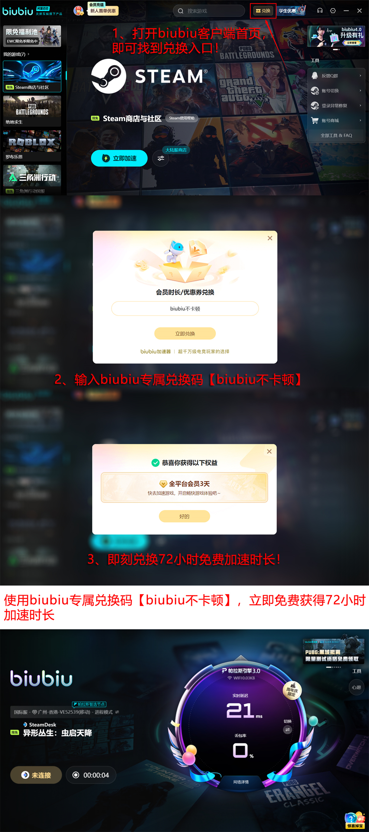 新用户注册后可立即享受24小时无门槛加速服务,作为平台新人专属权益;另附赠一次通用兑换码使用机会——输入【biubiu不卡顿】即可额外获取72小时加速时长。两项叠加后,新账号总计享有96小时全功能体验周期,充分满足深度测试需求。