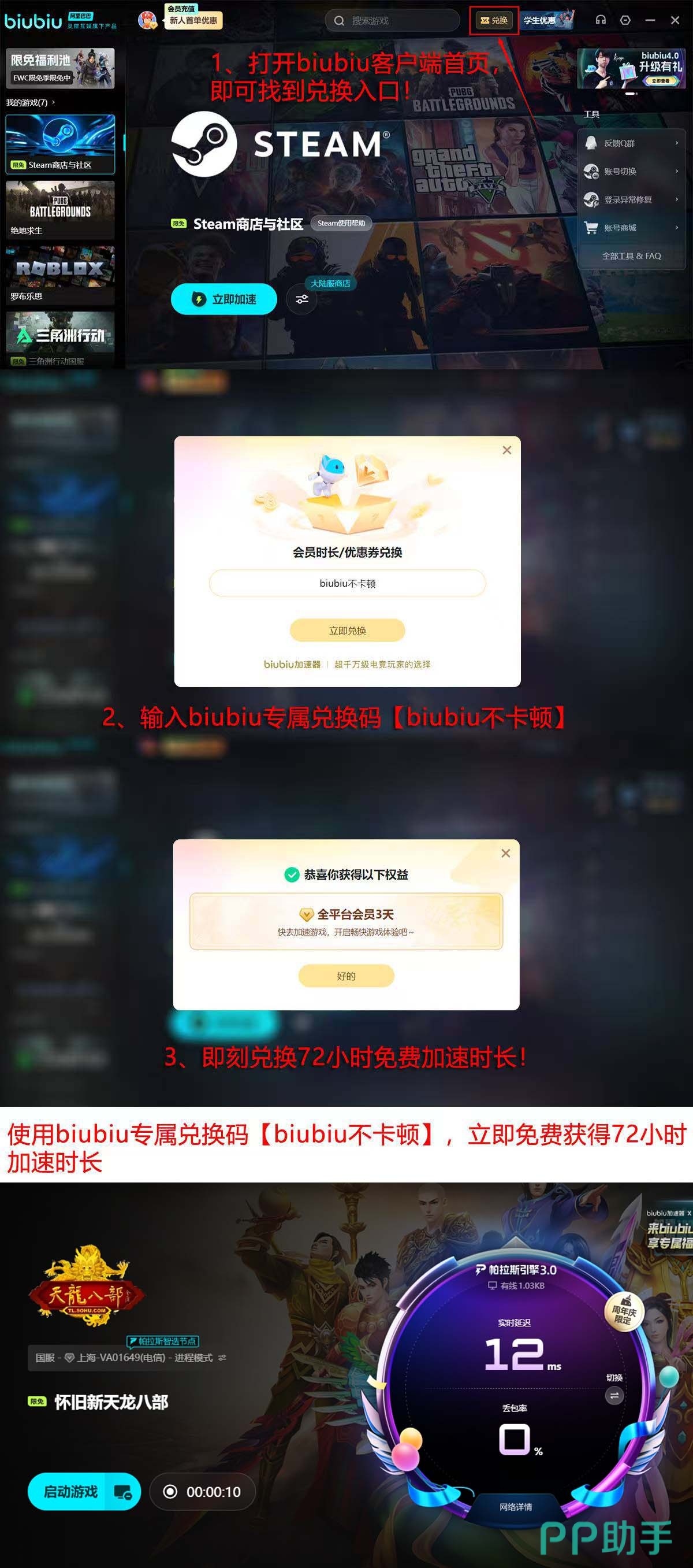 目前,biubiu加速器面向所有用户提供无门槛试用权益:新用户注册即赠24小时全功能加速时长;完成会员身份绑定后,可在首页输入口令【biubiu不卡顿】兑换额外72小时,累计可享96小时免费体验。该权益覆盖全部加速节点与游戏列表,无需额外付费或订阅限制。