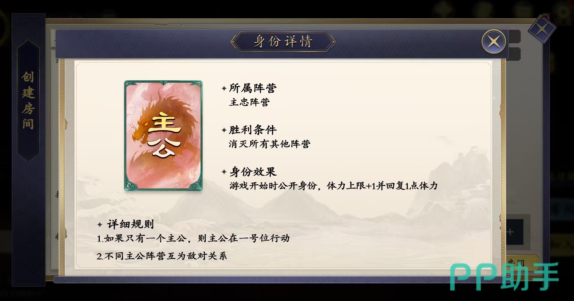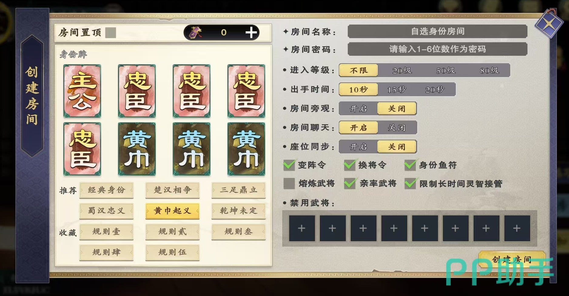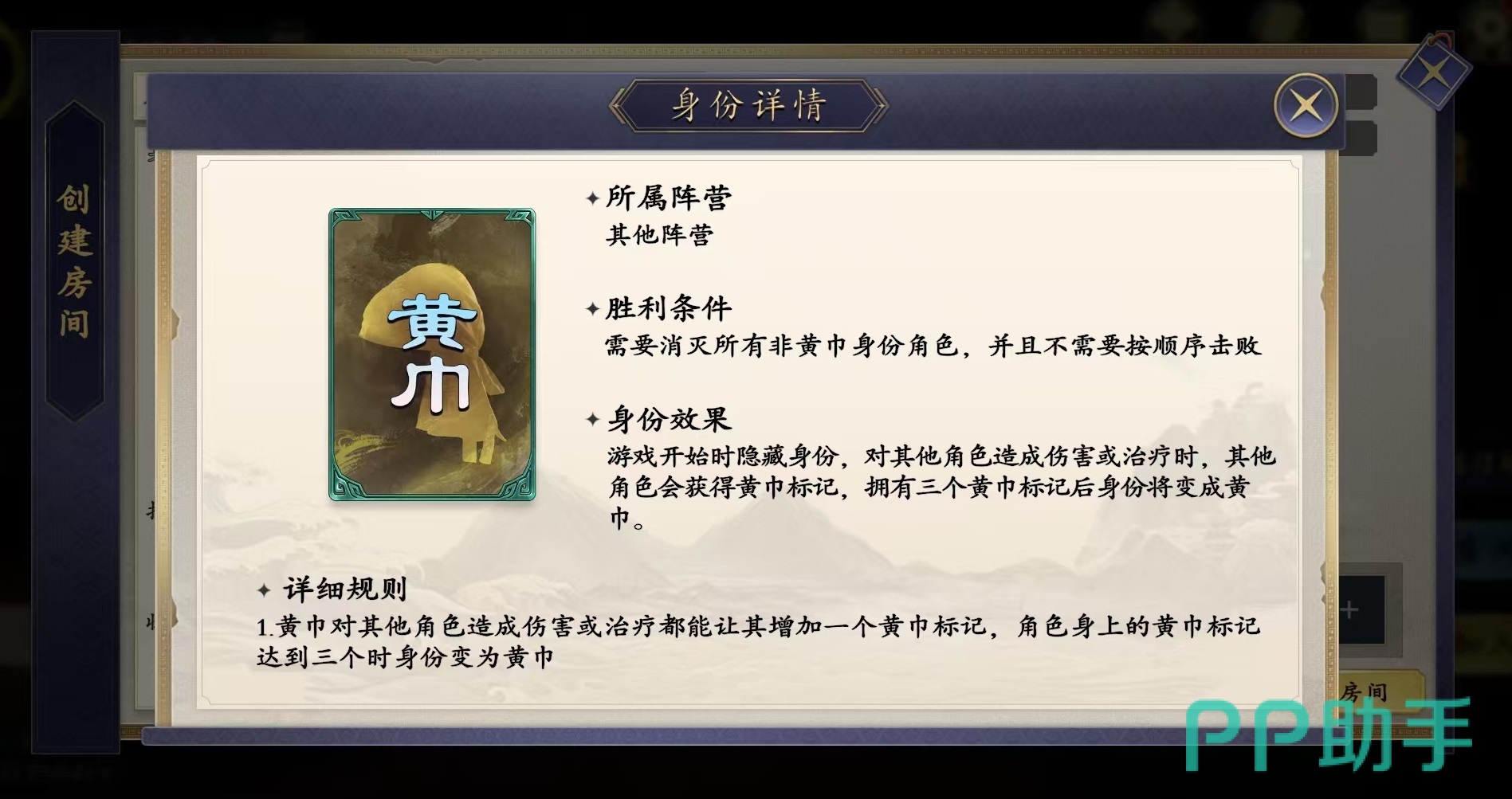如果大家想要玩黄巾起义,只需要点击创建房间,然后选择推荐中的黄巾起义就可以了,系统会自动根据需求配置好不同的身份牌。黄巾起义一共有三种不同的身份,分别是主公、忠臣和黄巾。人数分配是主公一人,忠臣四人,黄巾三人。大家千万不要以为黄巾人数少,就认为黄巾阵营比较弱势,其实并非如此,每个身份都有自身的特点。主公的优势在于游戏开始时公开身份,体力上限增加一点,并且回复一点体力,而且主公是在1号位行动。忠臣在游戏开始时需要隐藏身份,是保护阵营中的主公,如果主公阵亡,忠臣会直接失败。