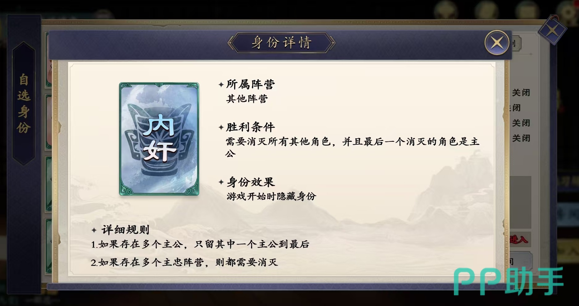 在这款游戏中,如果玩家选择不同模式,那么在身份设置方面也有一定的区别,如果选择的是最基础的2V2对战,那么没有身份方面的差异,如果选择基础经典玩法,那么身份规则就是简单的四阵营,主要包括主公,忠臣,反贼和内奸这四个。主公的获胜条件是消灭所有其他阵营,忠臣的目的就是为了保护主公,消灭其他阵营的角色,反贼自然是要先消灭主公,也可以先消灭忠臣。最后是内奸要先隐藏起来,等待时机成为最后一个存活的人。