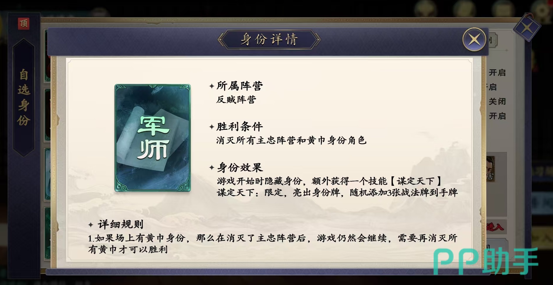 第十一个军师,可以主动公开身份,立即获得三张战法牌。第十二个先锋,可主动公开身份,能够和一名其他角色交换位置。第十三个内奸,没有特殊身份效果,需要先消灭其他角色,最后再消灭主公。第十四个黄巾,要消灭所有的非黄巾角色。第十五个刺客,在其他角色分出胜负之前,需要亲手消灭目标,可主动公开身份增加伤害。最后一个伪帝,游戏开始时可以先伪装成主公或者是明主,也可以主动公开身份,对并对其他所有的角色造成一点伤害。