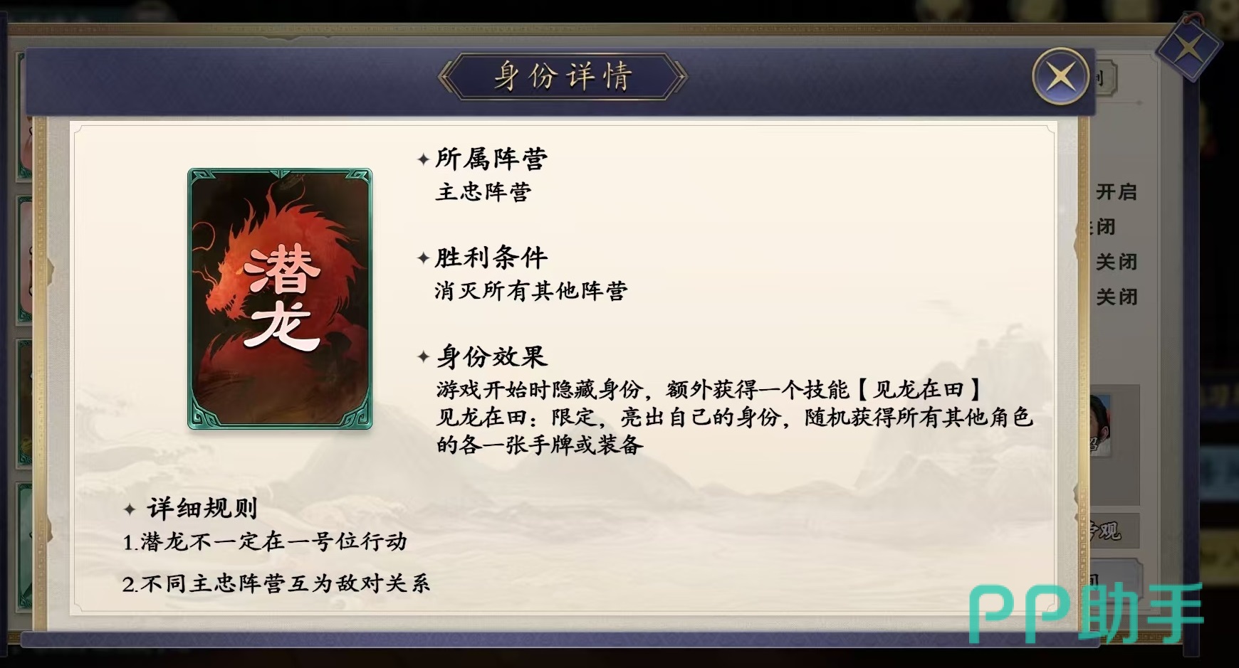当大家集齐12个武将时,可以开启竞技里的身份模式,这个模式有更丰富的身份组合。一共有16种不同的身份,这是大家最犯愁的地方。身份一共包括潜龙、明主、忠臣、储君、上将、禁军、反贼、盟主、军师、先锋、内奸、黄巾、刺客和伪帝。这时的身份玩法迥异,有着不同的身份效果和胜利条件。第一个主公,目标是消灭所有其他阵营,没有特殊的技能,开局公开身份,自带体力上限加1,并且回复1点体力的生存优势。第二个先主,在主公阵亡之后可以继承身份。第三个潜龙,限定技能可以亮出身份牌,随机获得其他角色的各一张牌,开局隐藏身份,待时机成熟公开后可以快速拿大量的牌。