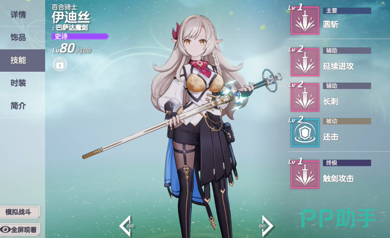 伊迪丝在游戏中的职业定位是斗士,技能组中除了基础的伤害技能外,还有着可以对敌方单位带来控制效果的技能,接下来我们就先了解一下伊迪丝妖精队的这名核心角色。她的主要技能是圆斩,这也是她的强力控制技能,使用后将以距离最近的敌人为目标,造成范围伤害,且伤害倍率为惊人的240%,所有受到伤害的敌人都会立马进入眩晕状态,效果持续三秒,当自身持有4-6个增益的时候,还能接触攻击目标拥有的2-4个增益buff,并一触发技能暴击