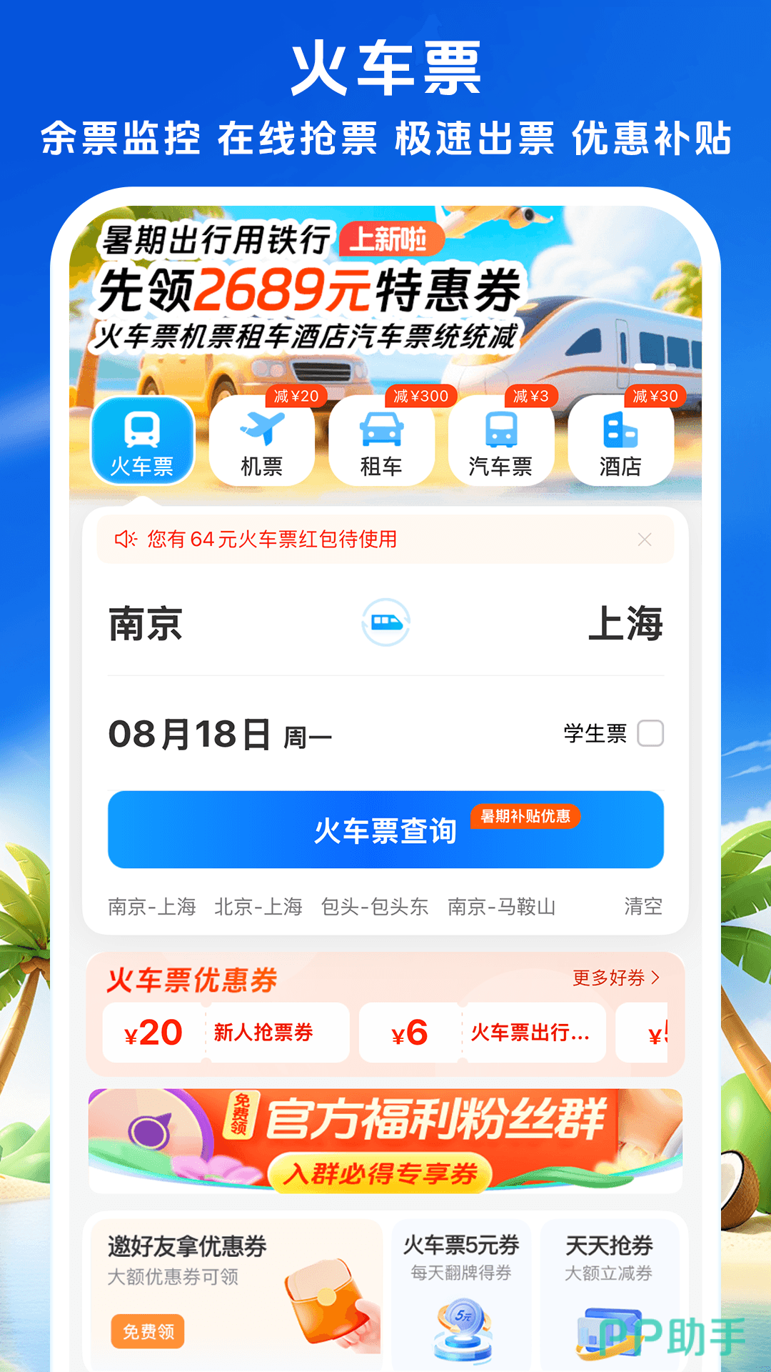 这款软件直连官方系统,票源正规无套路,没有隐藏手续费也不捆绑保险。帮亲友买票也很方便,建个同行小组就能一键代订。余票监控很灵活,有退票秒提醒,临时改变行程也能先上车再补票。还能经常蹲到特价票,搭配着它家的特价酒店一起预订,出行成本直接砍一半。