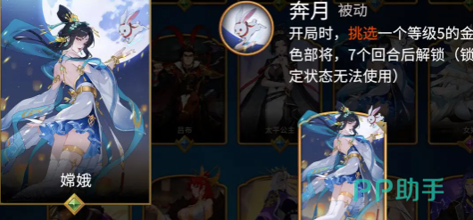 嫦娥是经济流代表之一,其被动“奔月”可在对局开局即锁定一张五费金色部将;该效果于第8回合正式生效,等效于提前获得一张六费卡,资源转化效率极高。前期建议主动跳过四费以下低质过渡卡,集中金币搜寻优质四费卡构建中期战力。因前八回合技能尚未触发,若强行拼战力易导致血量大幅流失。待金色部将解锁后,可依据场上情况灵活切入青龙或白虎阵营体系,完成阵容升级。