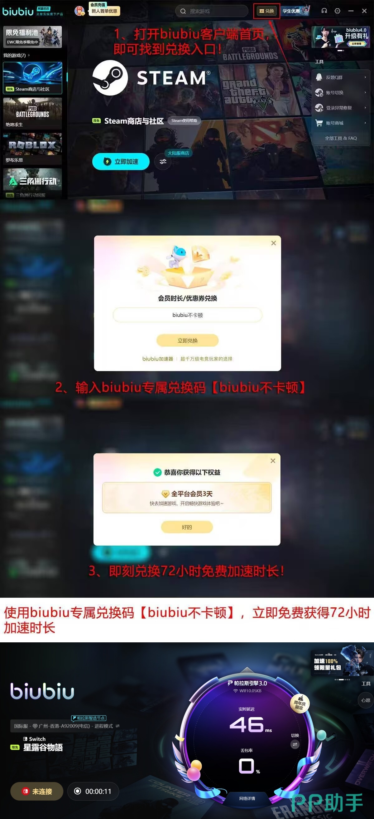 为降低用户使用门槛,平台推出多项实用权益:新注册用户可直接领取24小时全功能免费试用时长;完成首次启动后,进入兑换页面输入口令【biubiu不卡顿】,即可额外获取3天高级会员权限,该口令面向所有用户开放,不限新老账号;活动期间(2025年12月18日至2026年1月18日),biubiu加速器还将上线限时免费游戏池,涵盖多款热门作品,用户可自由选择加速体验。