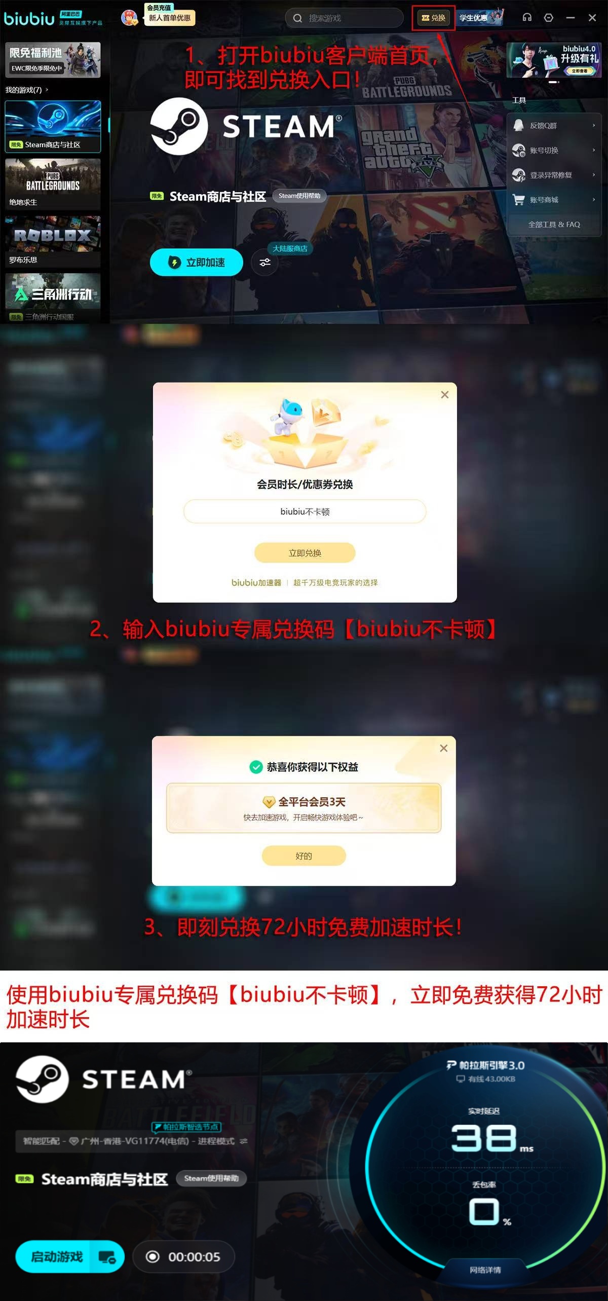 现面向新用户提供分阶段体验权益:首次注册即可获赠24小时全功能加速权限;输入口令码【biubiu不卡顿】还可额外激活72小时服务,累计享96小时无限制加速。同时开放好友协作机制,邀请队友共同使用,双方均可获得加速时长加成,有效提升多人联机场景下的连接稳定性与操作一致性。