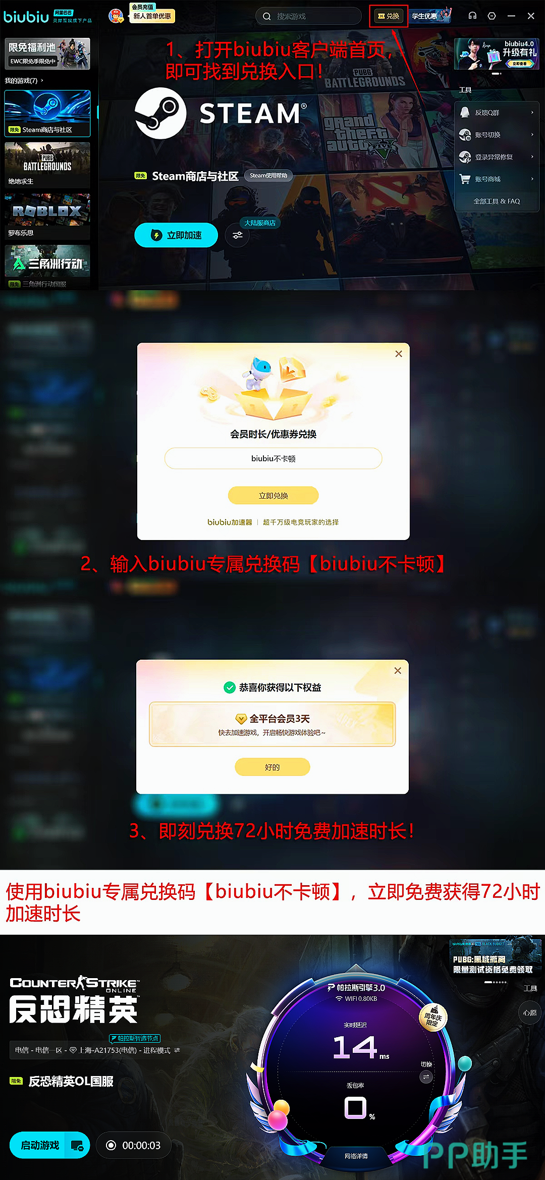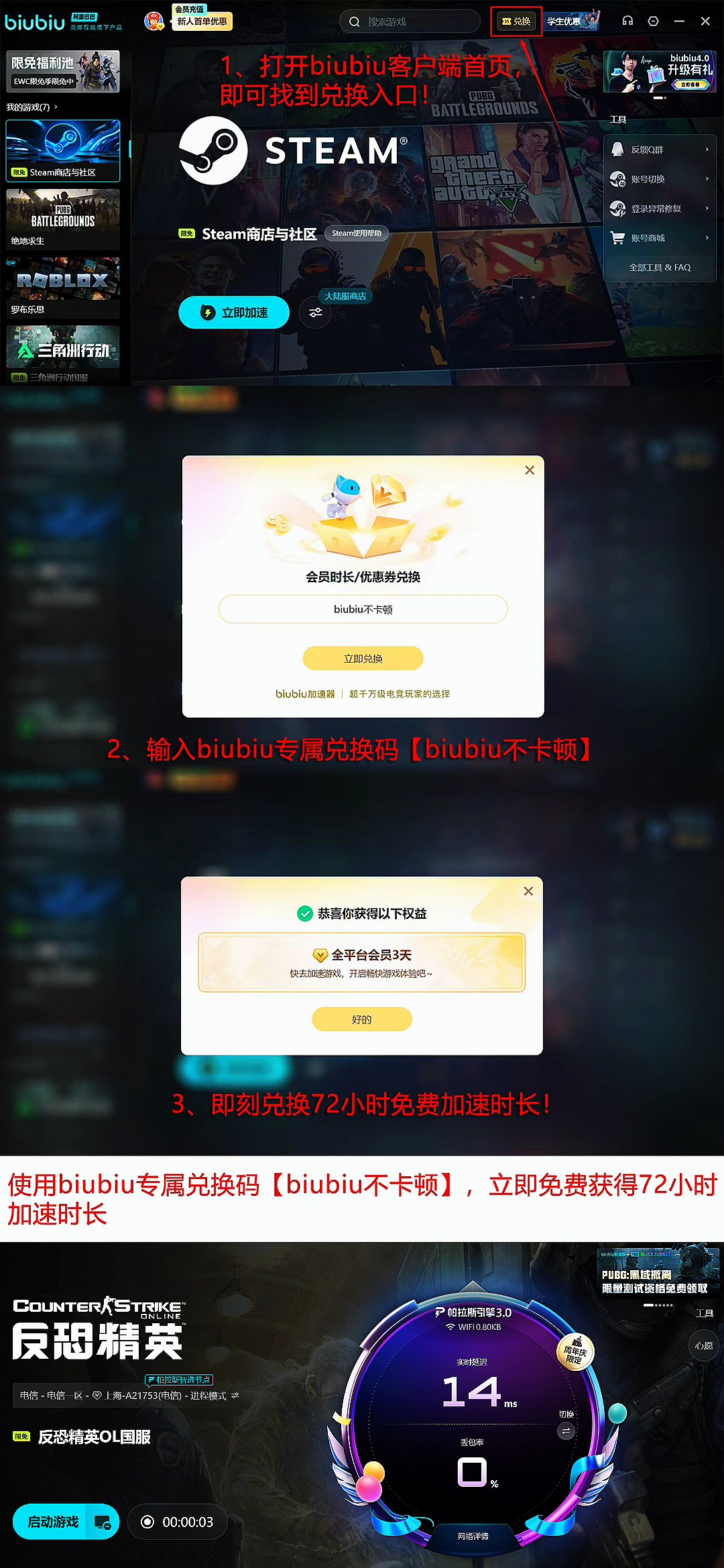 对于高频参与联机对战的用户,建议将biubiu加速器纳入常规使用方案。新用户注册后自动享有24小时全功能免费试用权益;输入专属兑换码【biubiu不卡顿】还可额外激活3天连续加速权限,累计可获得96小时无限制服务体验。该兑换机制面向全体账号开放,不限制新老用户身份。
