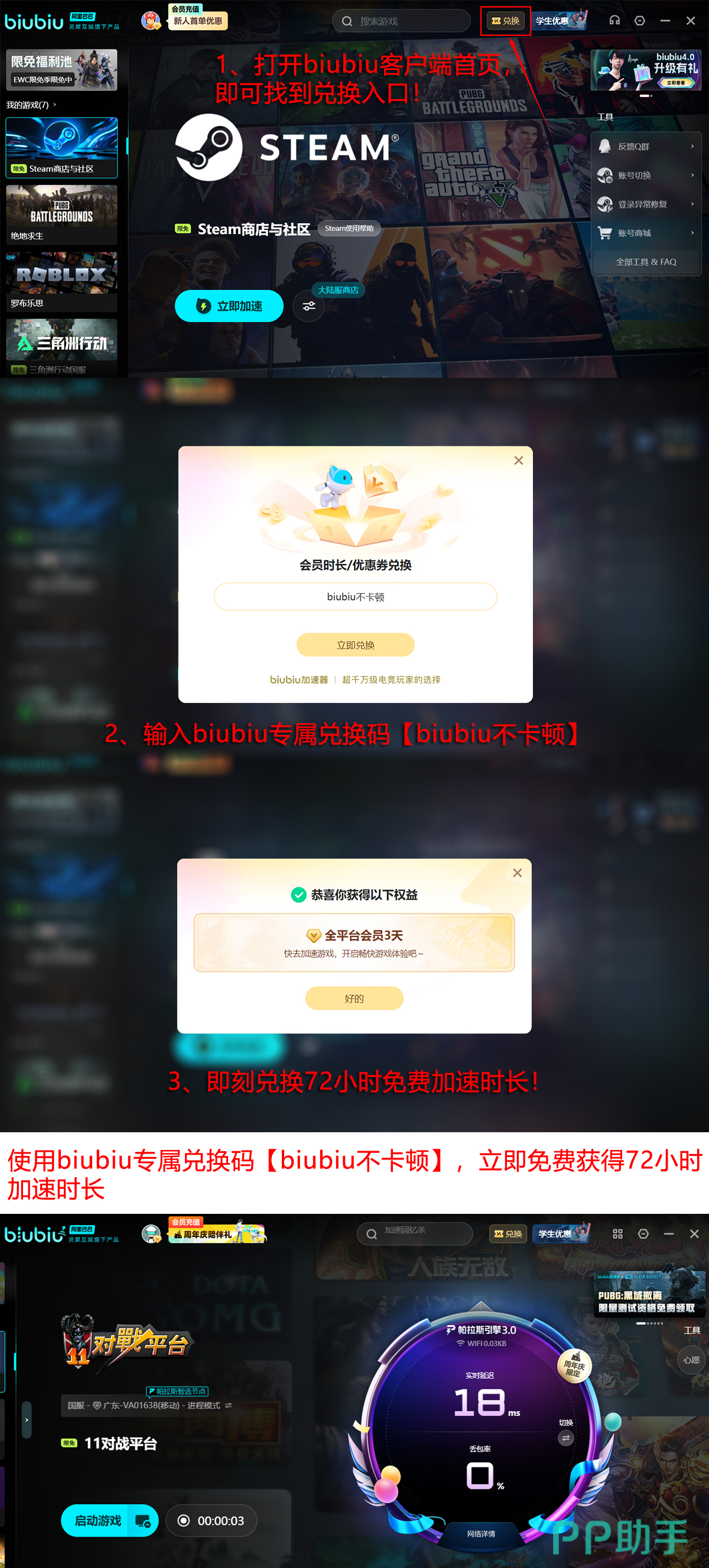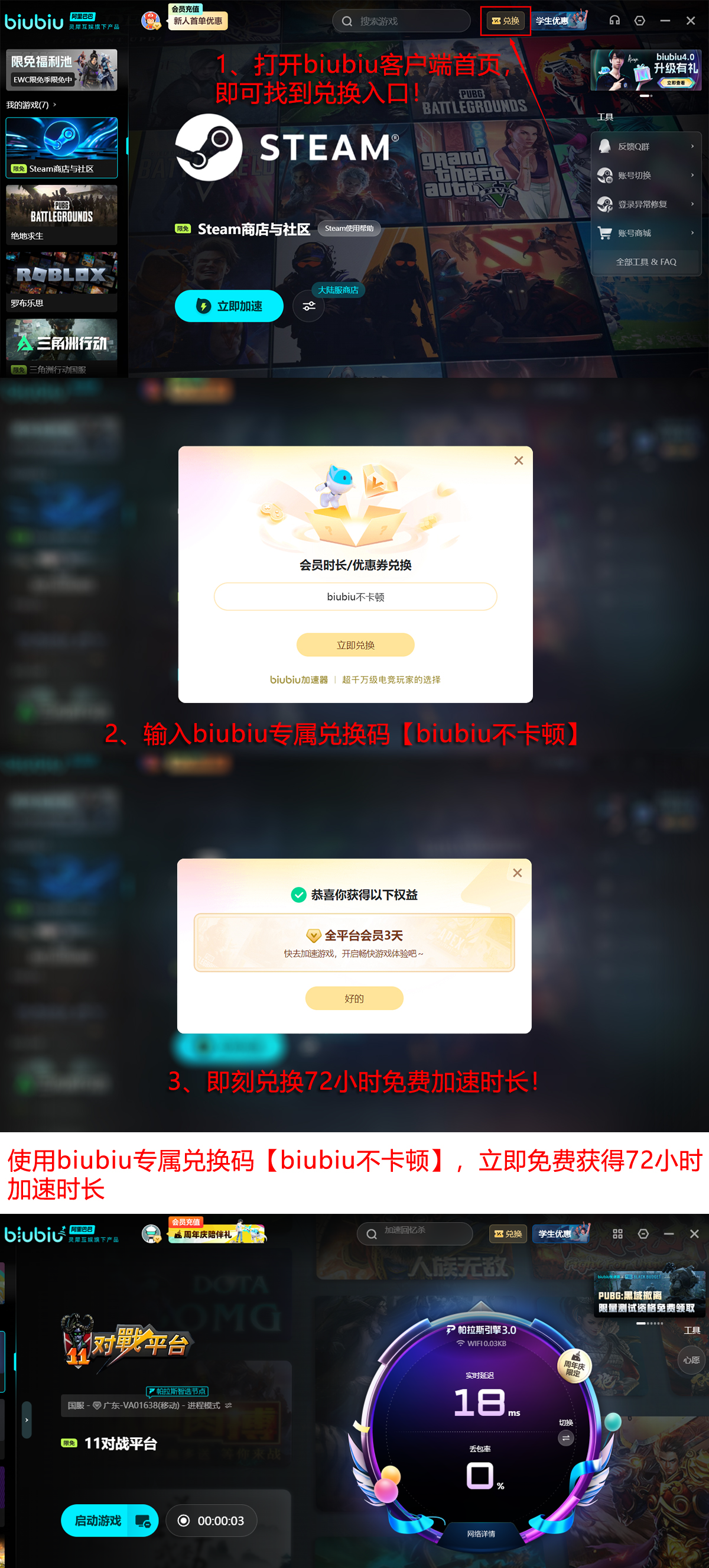 新用户完成注册即可获赠24小时全功能免费加速权益,可充分验证实际优化效果;如认可服务品质,输入兑换码【biubiu不卡顿】还可额外领取3天加速时长,新老用户各限使用一次。对首次使用者而言,相当于累计享有96小时无门槛加速体验,足够支撑多场高强度排位赛,切实助力段位提升。