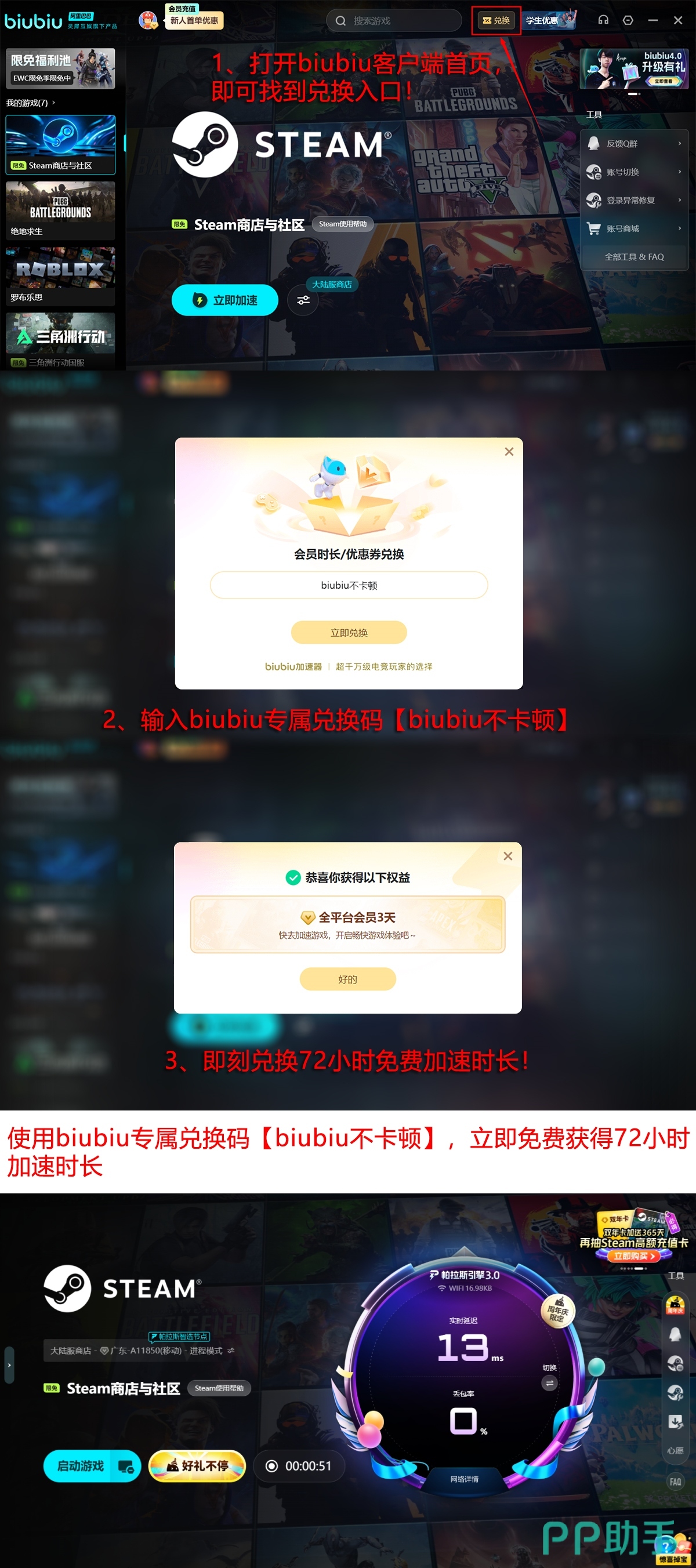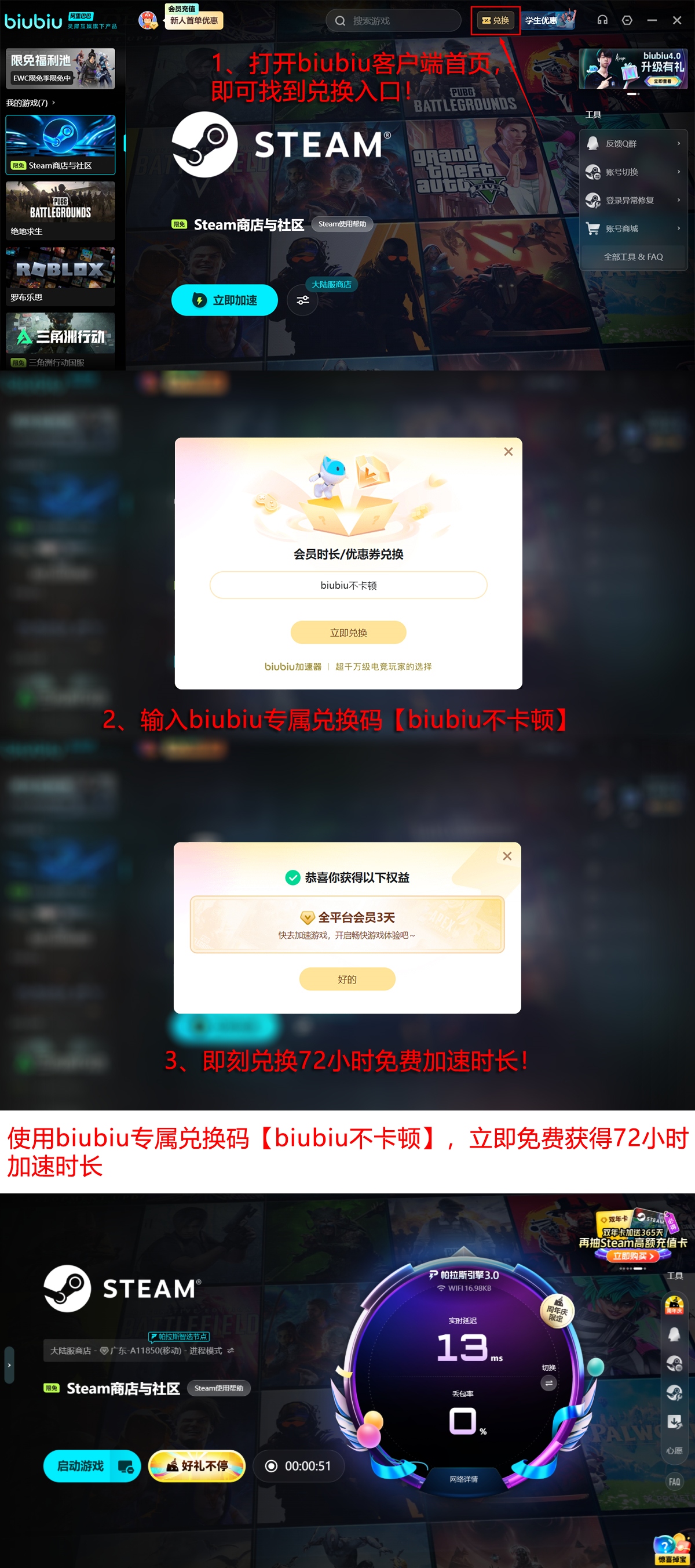 目前,新用户完成注册登录即可免费使用24小时完整功能。另开放限时福利:输入兑换口令【biubiu不卡顿】,可额外领取3天加速时长。新用户累计可享96小时无限制体验,覆盖完整安装、更新及多周目通关周期。