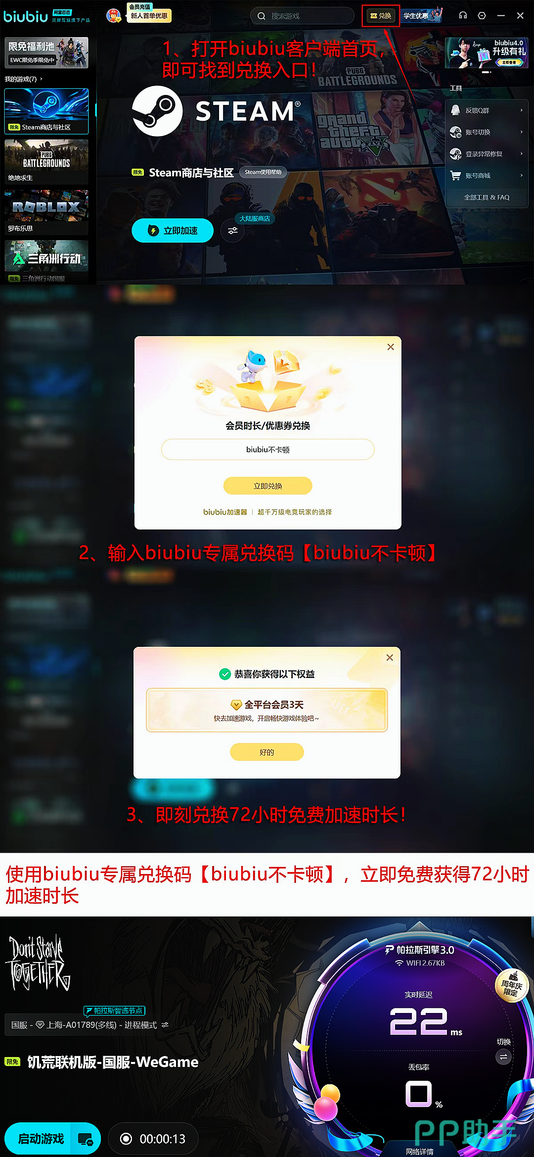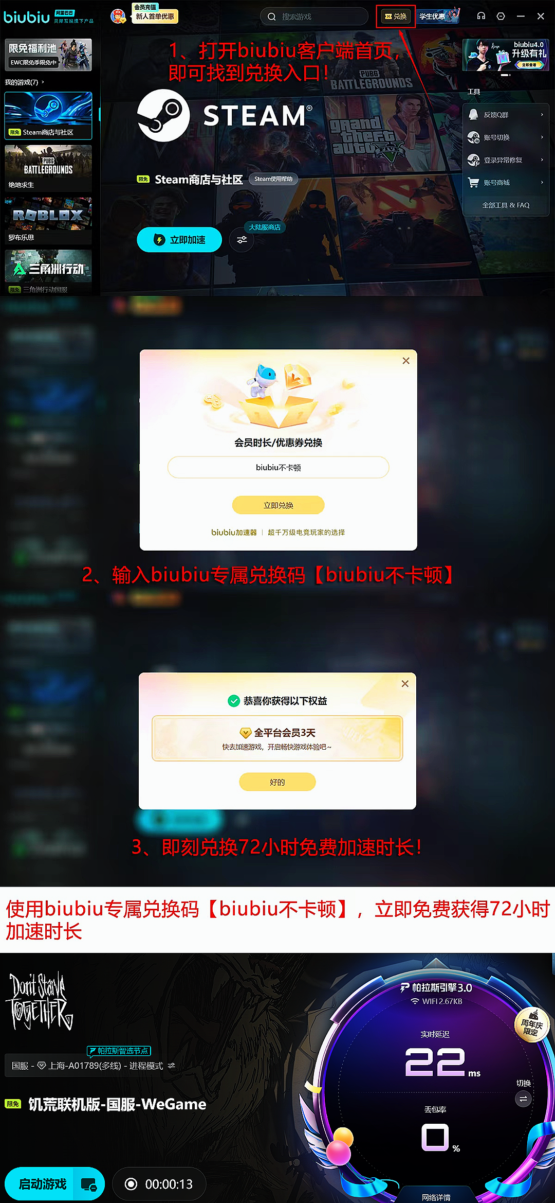 对于首次使用用户,注册后即可领取24小时全游戏通用加速时长;所有用户凭兑换码【biubiu不卡顿】可额外激活3天高级服务权限,涵盖优先带宽调度、专属加速通道及实时网络健康监测功能,充分满足新玩家深度体验需求。