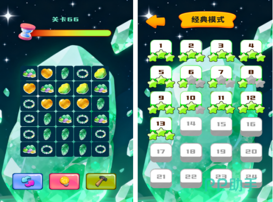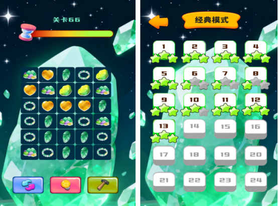 将传统消除机制与玉石文化元素巧妙融合,游戏中呈现数十种真实还原的玉石品类,配以高清材质表现。玩法采用标准横纵三连规则,辅以特色道具系统——如可清除整行的锤子、引爆区域的电灯泡等,策略性适中,既保留解谜乐趣又避免复杂操作。星级评价依据通关效率与剩余步数综合判定。